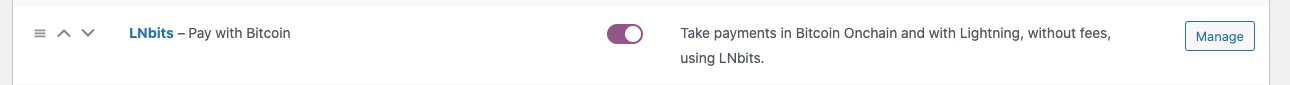 Open WooCommerce > Settings > Payments and activate the LNbits payment method, then click manage.