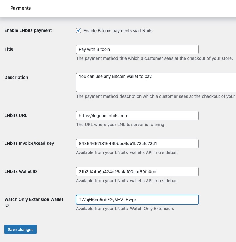 Enter the LNbits URL for your LNbits server and paste in your settings for the Invoice/Read Key, Wallet ID and Watch Only Extension Wallet ID